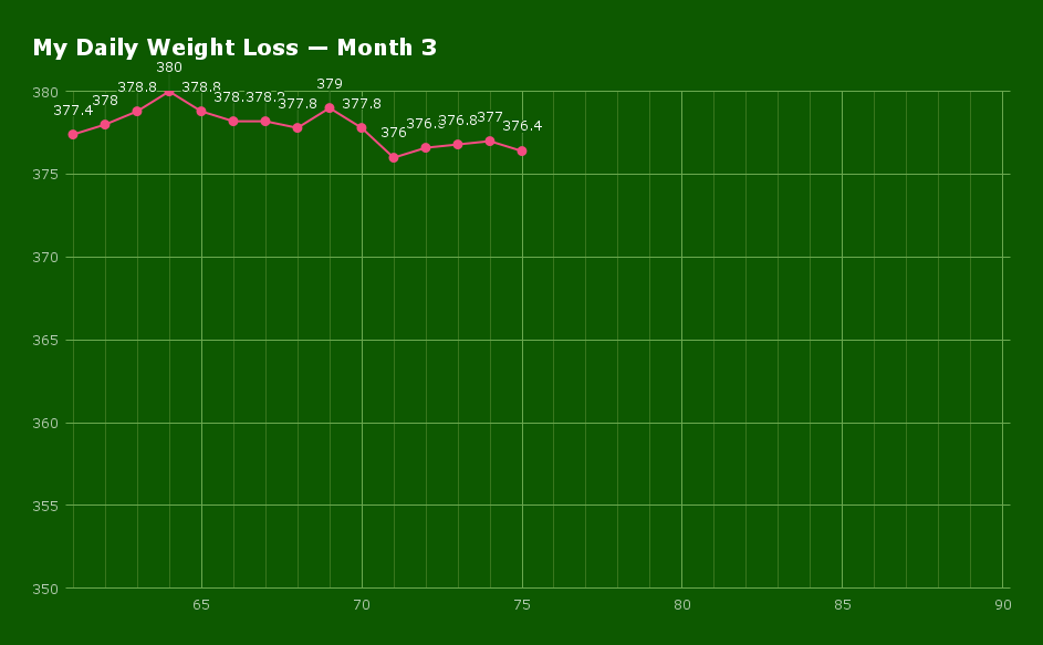 Yay! I'm down by about .6 lbs today. My scale gave me a very pretty 376.4 lbs today. It's no 376 lbs even, but who am I to complain? I'm under 377 lbs. Heck! I'm under 400 lbs, for that matter! I never thought I'd see this side of 400 lbs again, but here I am, almost 25 lbs below that mark.